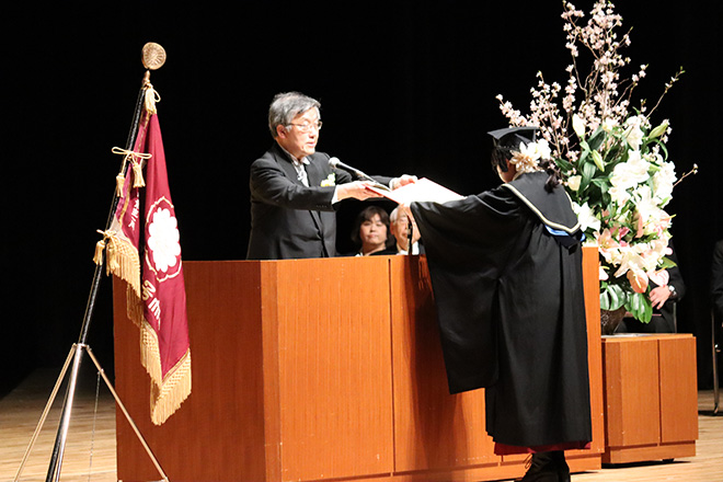式典は、マンドリンクラブによるオープニングセレモニーの後、開式されました。各学科や研究科の総代に卒業証書・学位記が授与されたのち、田畑雅英学長より「卒業生におくることば」、風間誠史理事長、同窓会翠葉の田中百子会長より「お祝いのことば」が述べられました。