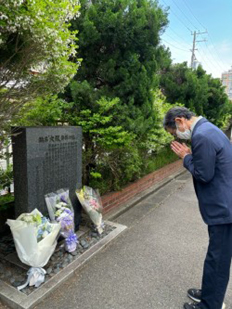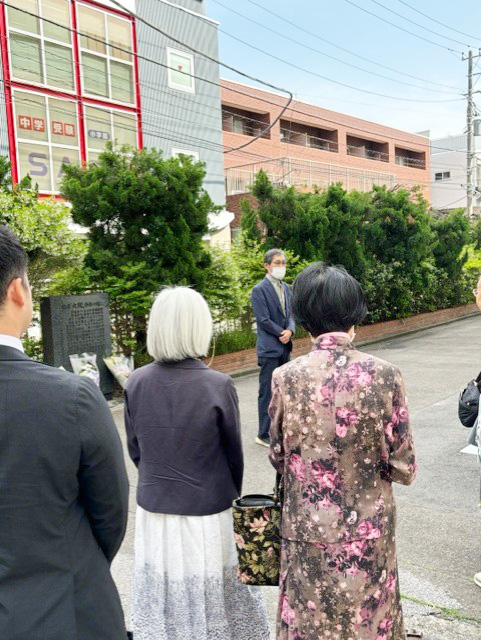 風間誠史理事長らが帝国女子専門学校跡地にある碑を訪れ、戦災犠牲者を慰霊しました