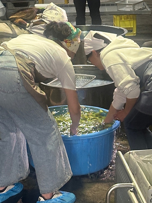 本活動には、先週実施した梅の実収穫にも参加した学生4名が参加し、梅の実を洗う作業、梅の実のヘタを取る作業、漬け込み作業、それぞれの工程にわかれて作業を行いました。