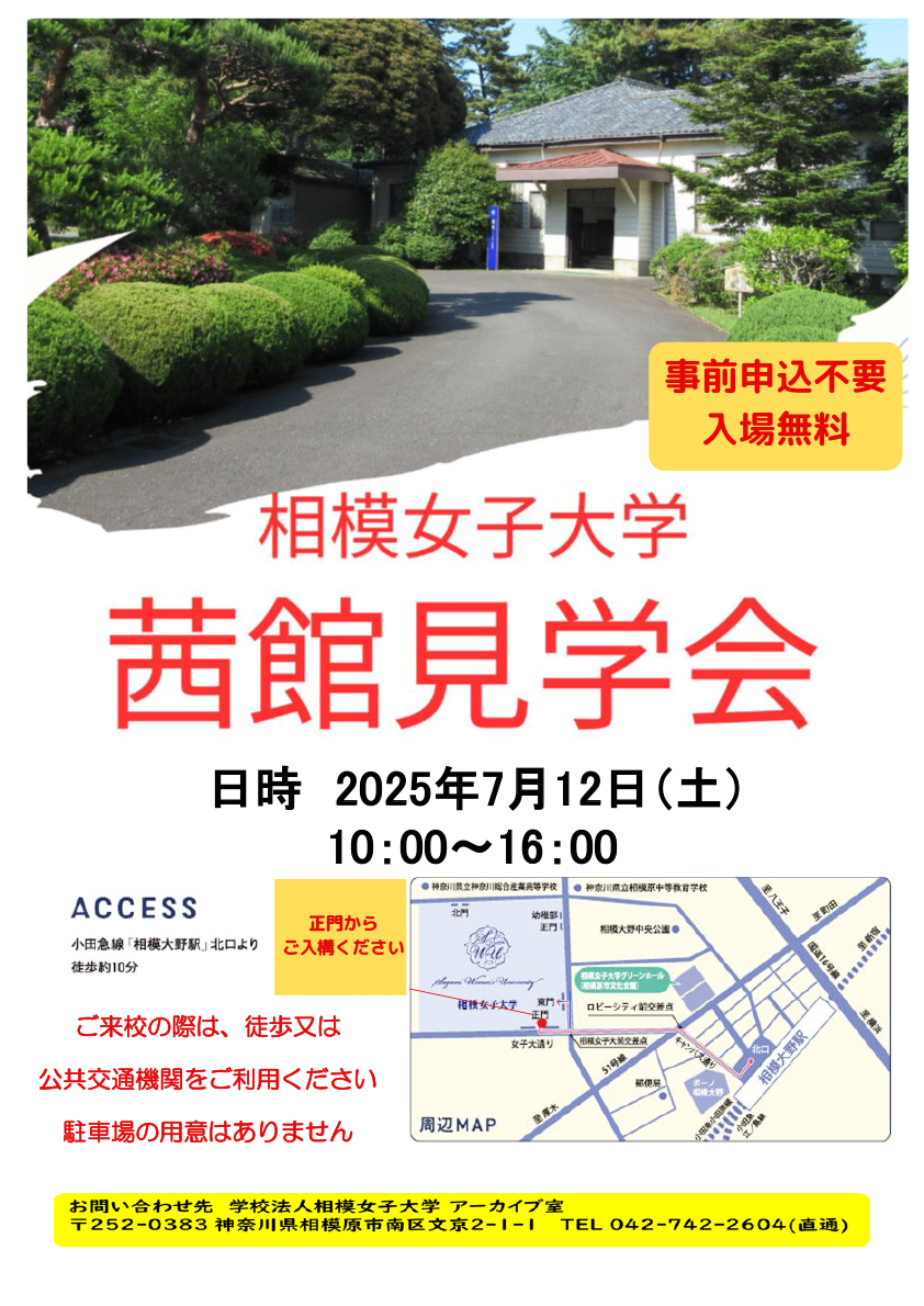 | 問い合わせ先 | 学校法人相模女子大学 アーカイブ室 〒252-0383 神奈川県相模原市南区文京2-1-1 TEL 042-742-2604(直通) |