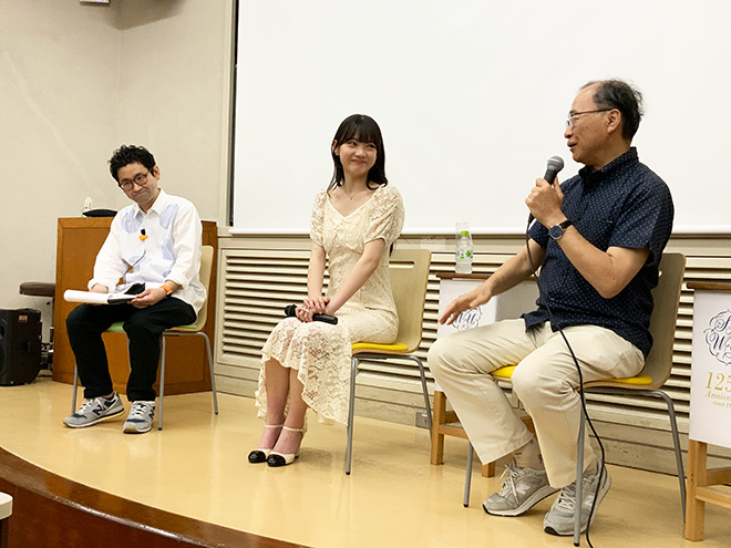 本学学生と高等部生徒対象のイベントでしたが、参加した学生からの質問コーナーもあり、皆、熱心に聴き入っていました。