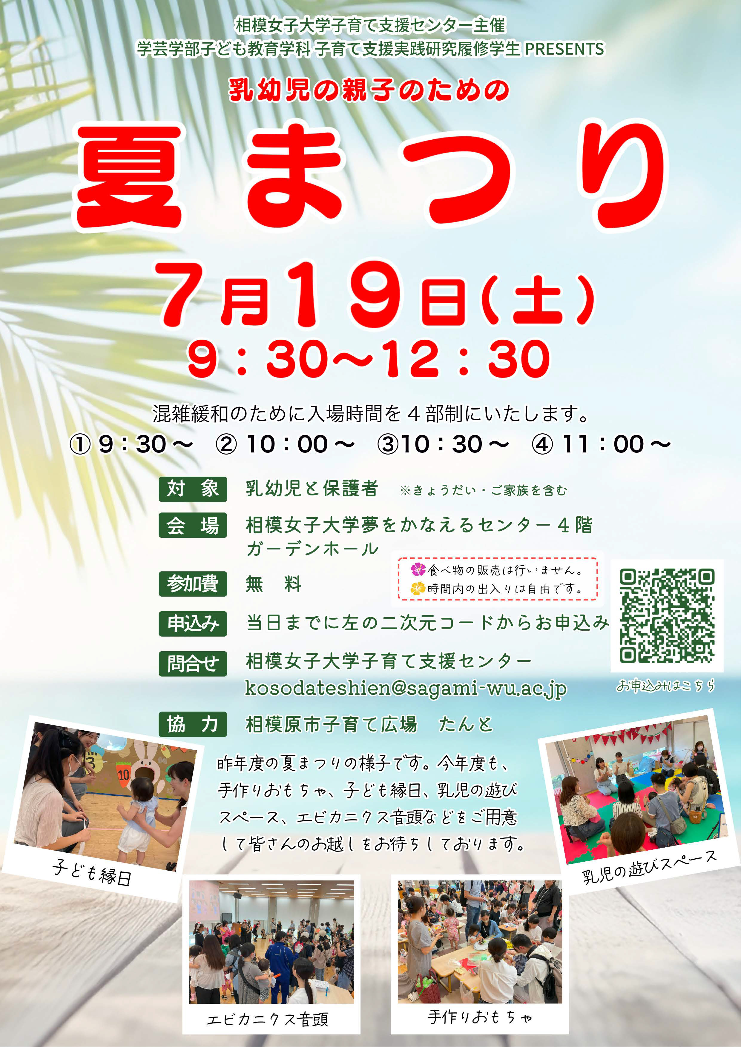 この度、7月19日(土曜日)に子育て支援センター主催、「子育て支援実践研究」履修学生+有志学生による「乳幼児の親子のための夏まつり」を開催いたします。