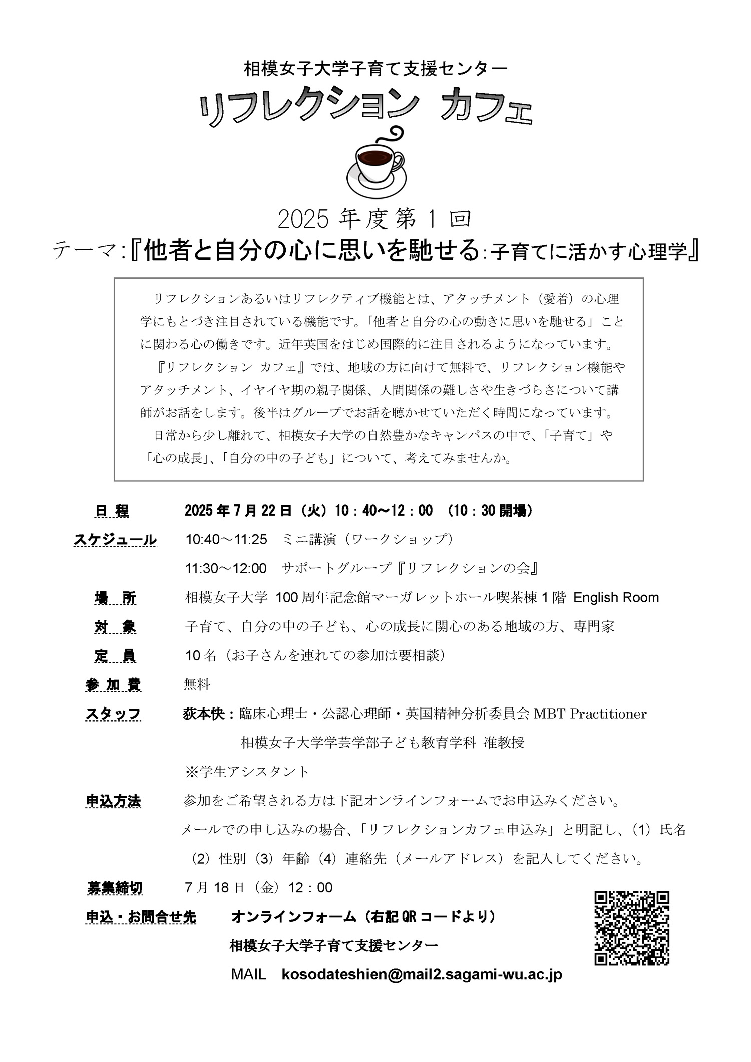 ホーム >  大学からのお知らせ >  【子育て支援センター】2025年度 第1回リフレクション カフェ開催のお知らせ[7月22日・火曜日]