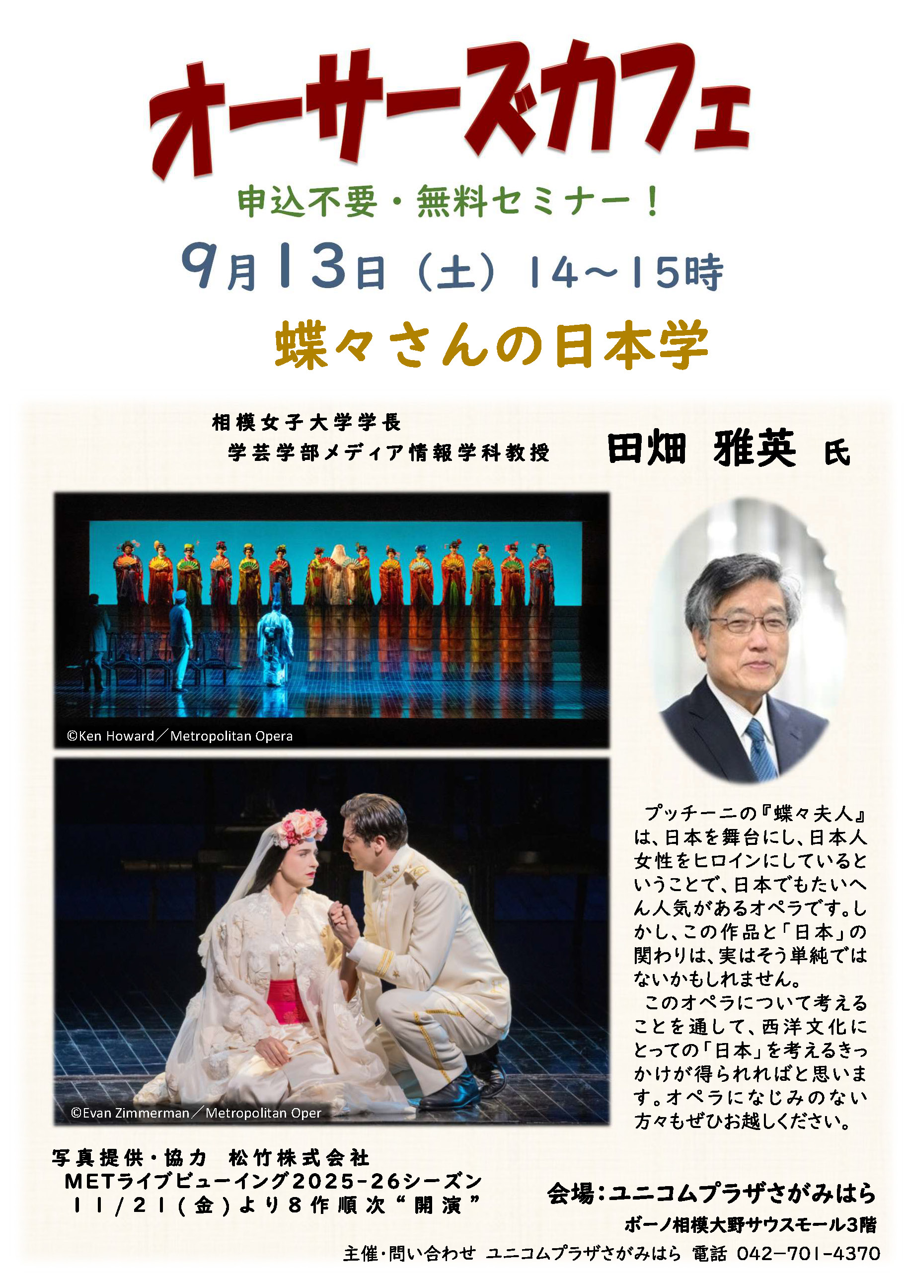 ホーム >  大学からのお知らせ >  【日本学国際研究所】ユニコムプラザさがみはらにて田畑雅英学長によるオーサーズカフェ「蝶々さんの日本学」が開催されます