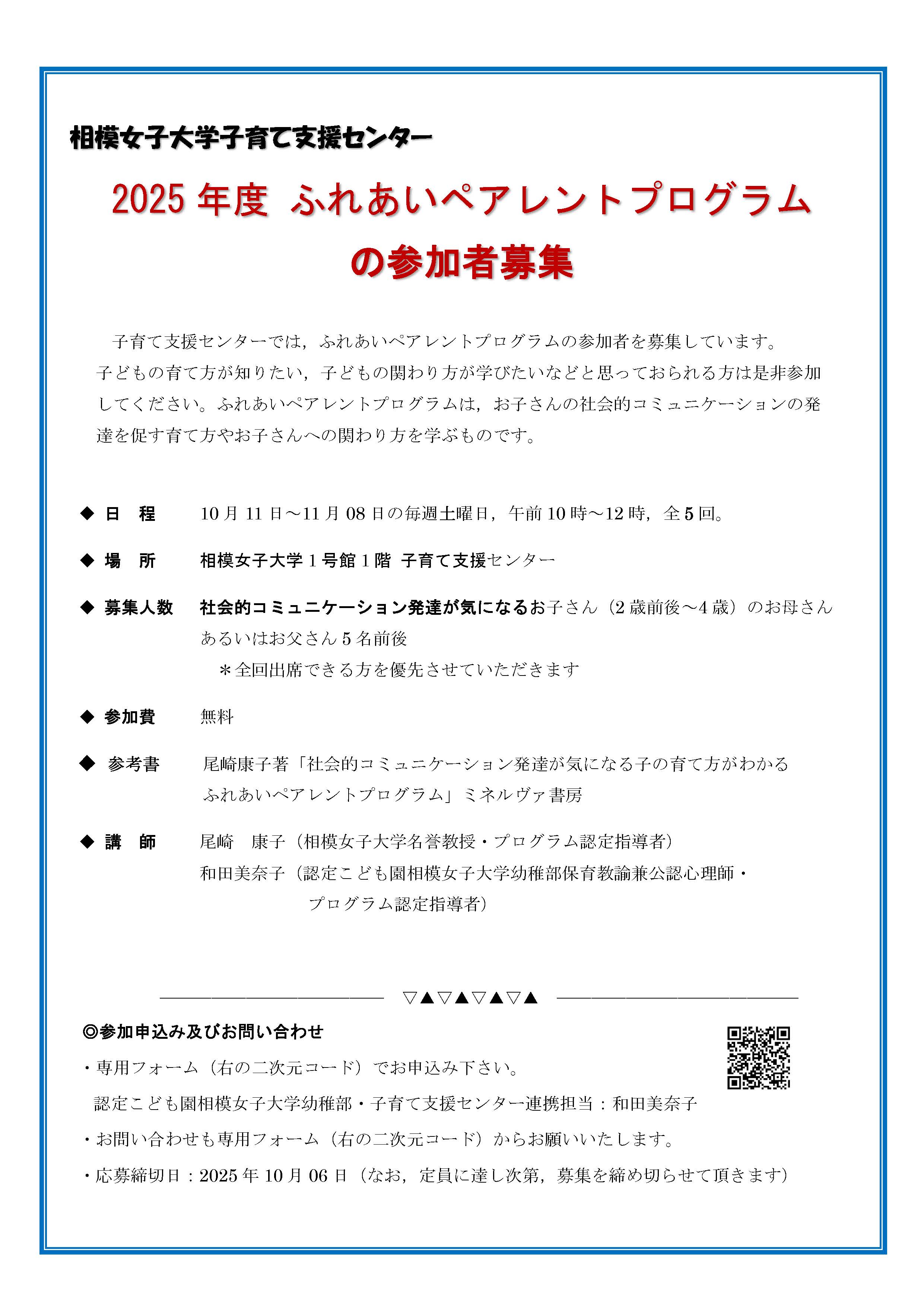 ホーム >  大学からのお知らせ >  【子育て支援センター】2025年度ふれあいペアレントプログラム開催のお知らせ[10月11日~11月8日・毎週土曜日・全5回]