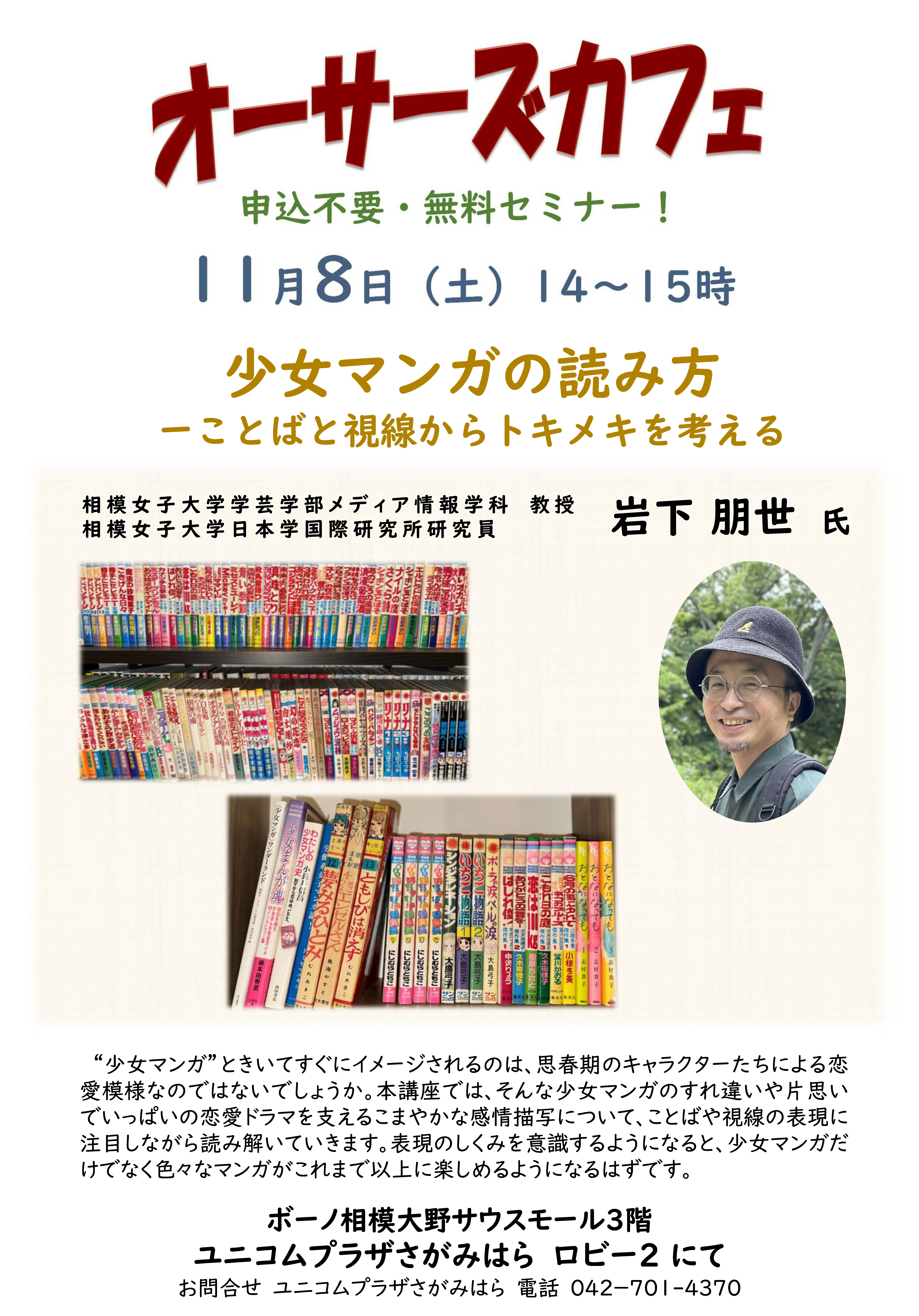 【日本学国際研究所】ユニコムプラザさがみはらにて岩下朋世教授によるオーサーズカフェ「少女マンガの読み方―ことばと視線からトキメキを考える」が開催されます