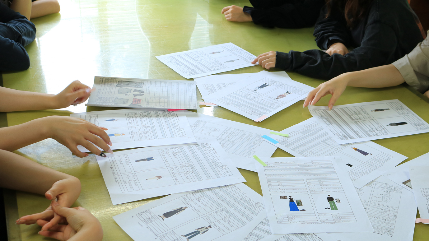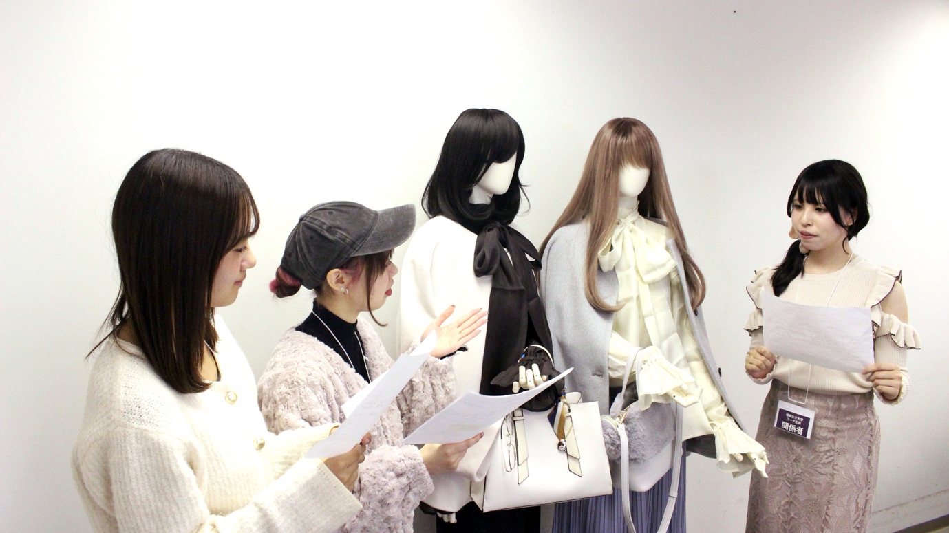 本取り組みは、生活デザイン学科の授業「ファッションデザインⅠ」(担当:生活デザイン学科 教授・角田千枝)の課題として行われました。学生たちは、ペルソナ(想定ターゲット)ごとに4つのグループに分かれ、「①20代女性ペア」「②30代男女カップル」「③30〜40代の夫婦と子どもの家族」「④60代女性と孫」をテーマにコーディネートを企画。展示用パネルや空間全体の演出も学生自身が手がけます。