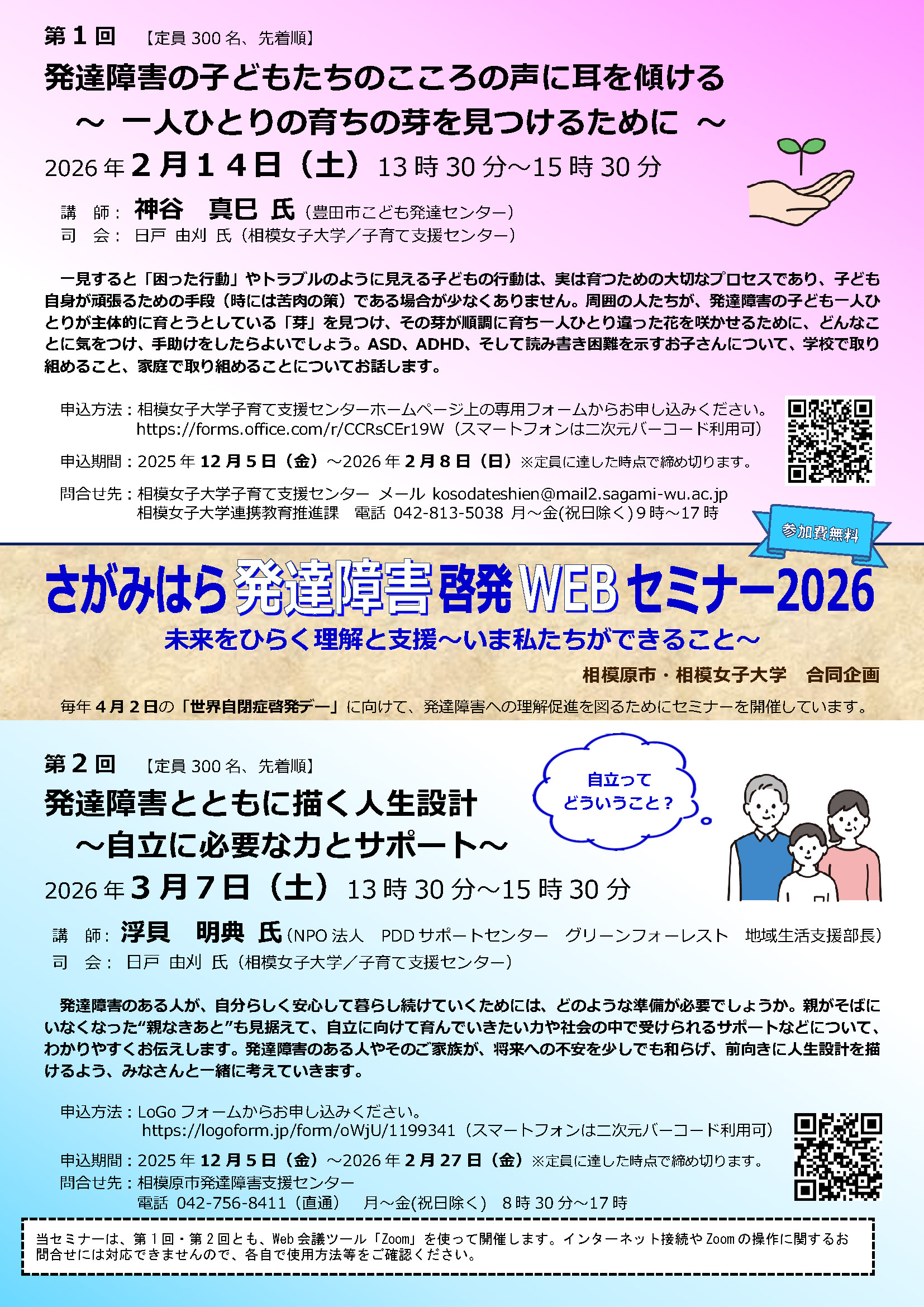 ホーム >  大学からのお知らせ >  【子育て支援センター】さがみはら発達障害啓発WEBセミナー2026『未来をひらく理解と支援~いま私たちができること~』第1回開催のお知らせ [2月14日・土曜日]