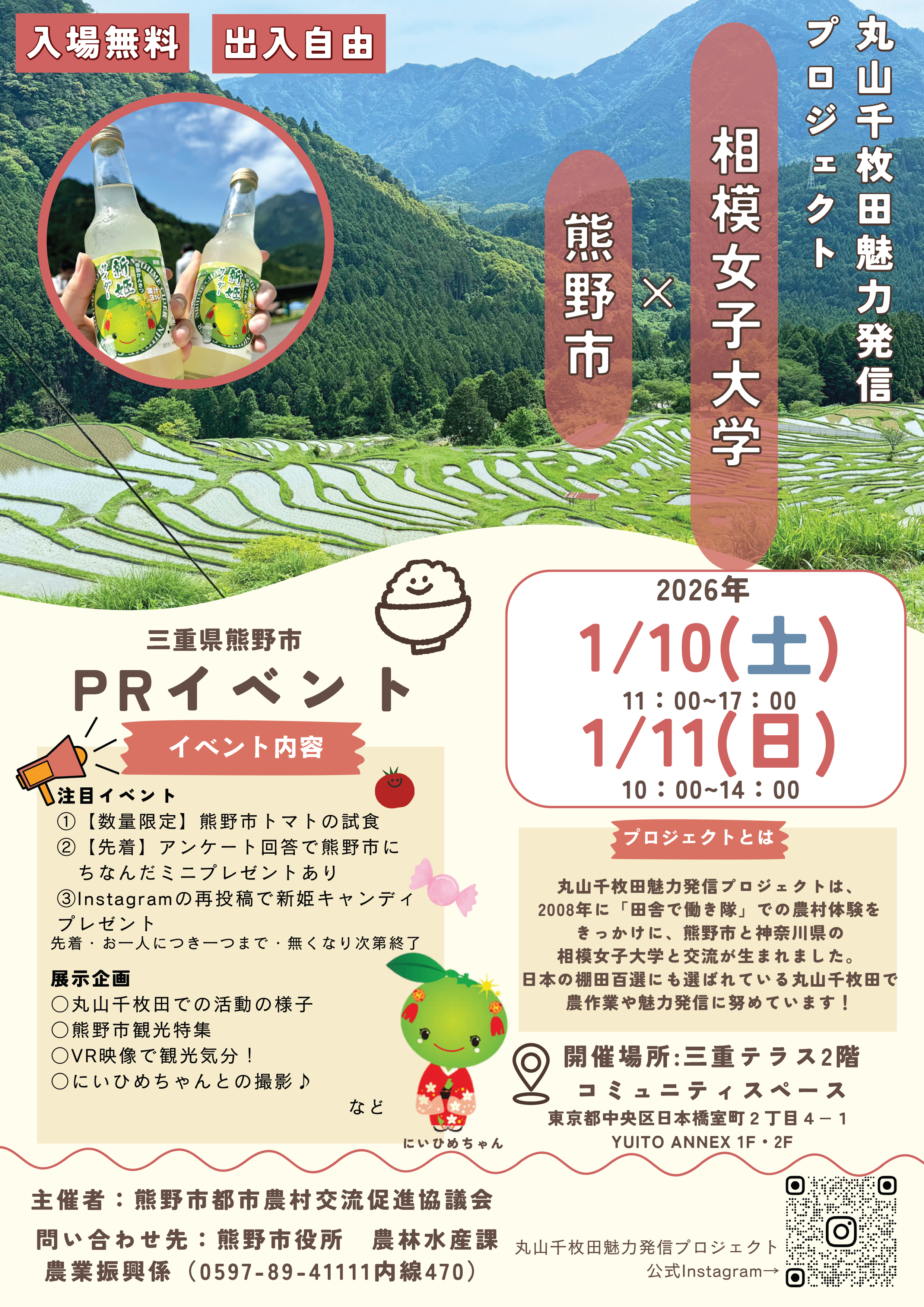 人口減少が進む三重県熊野市の地域活性化に取り組む丸山千枚田魅力発信プロジェクトのメンバーが熊野市と連携して丸山千枚田をはじめとする熊野市の観光や特産品をPRします。東京・日本橋の三重テラスで、稲作や香酸柑橘「新姫」の収穫を手伝っている学生たちが活動を紹介するとともに、ご来場者をおもてなし致します。詳細はチラシをご覧ください。