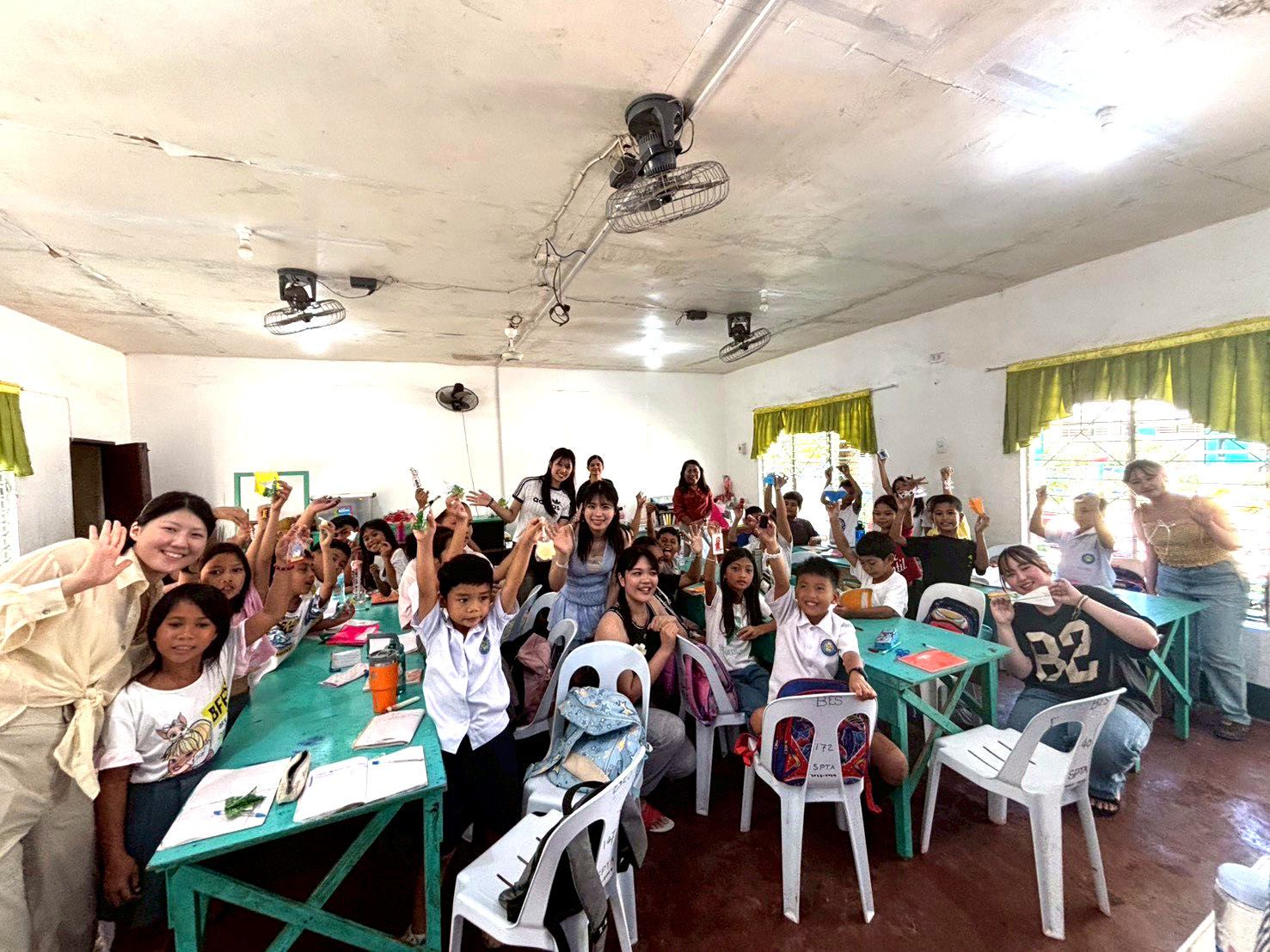 セブ島の小学校を訪問し、さまざまな学年の子どもたちと交流活動を行いました。参加したのは、社会マネジメント学科、国際コミュニケーション学科、子ども教育学科の学生で、それぞれの専門性を活かしながら協働する場面も多く見られました。