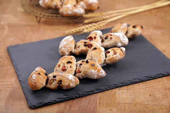 | 商品コメント | プティ・ボヌールはフランス語で「小さなしあわせ」 チョコとくるみ、クランベリーを練り込んだフランスパン |
