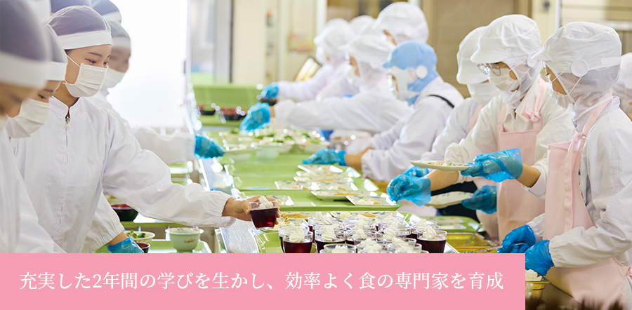 将来、自分は何をしたいのか。どんな栄養士になりたいのか。1年次に開講される栄養士入門講座では、自分の目的意識を明確にしながら、食と栄養に関する専門的な知識と技術を身に付けて、栄養士の資格取得をめざしていきます。2年次に開講される栄養士実践実習やゼミナールでは、社会に出て自分の武器となる「ひとつ上の学び」を修得します。また、正課外活動を全面的に推進して、学んだ知識を応用・発展させる場を展開します。
