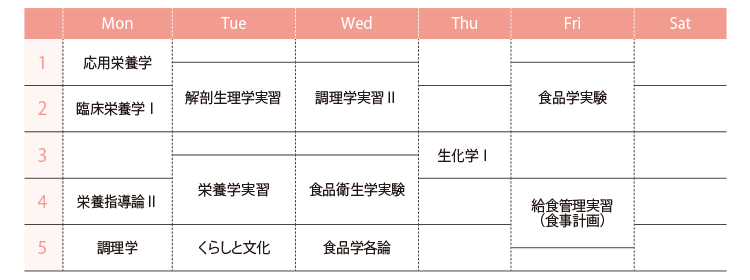 食品がもつ化学成分の特性や、食品成分表の数値の求め方を学習する「食品学実験」、さらには「食物栄養基礎演習」などの授業を通し、食に関する学びを進めます。