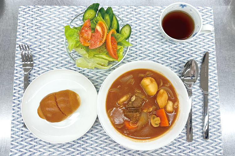 給食などの大量調理からクリスマスメニューなどの行事食まで幅広く学びます。