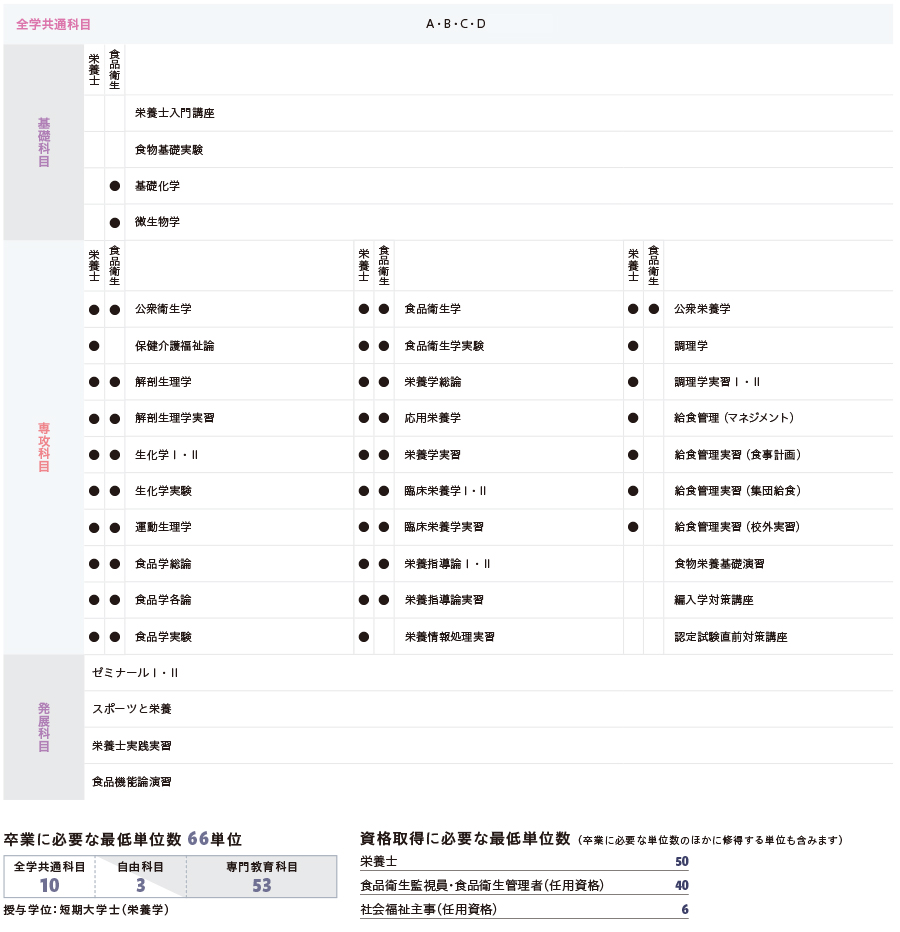 *食品衛生監視員および食品衛生管理者の任用資格取得には全学共通科目の指定科目を併せて履修する必要があります。