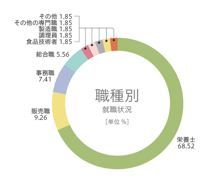栄養士(事業所・学校・幼稚園・保育園・老健施設・病院など)、食品会社(製造職・研究職・開発職・営業職・販売職など)、進学(4年制大学への編入学・専門学校など)、公務員 など