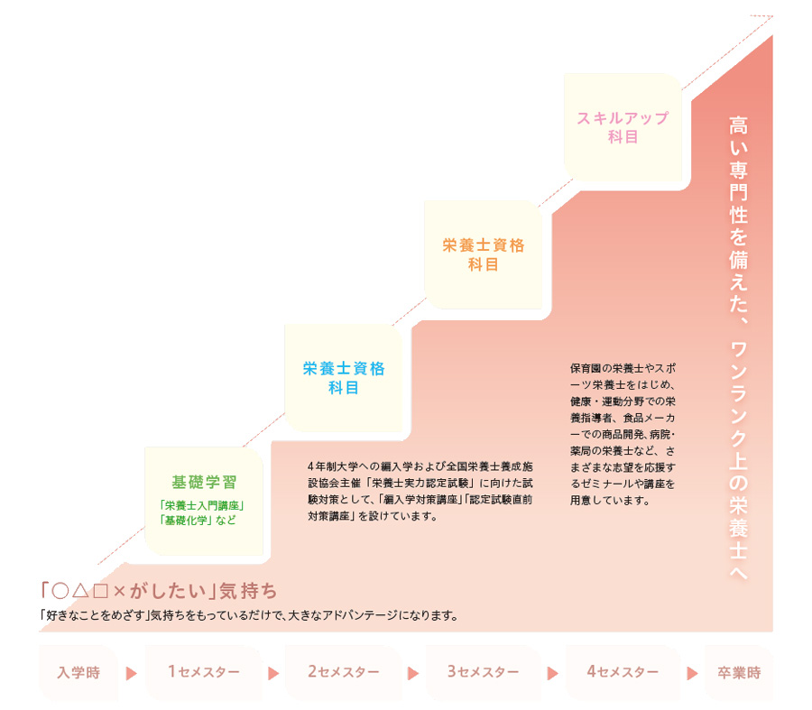 また、就職に向けてスキルアップをはかる選択科目として「栄養士実践実習」、「食品機能論演習」、「スポーツと栄養」、「ゼミナール I・II」を開講し、さらに高度な知識と技能を身につけられるようにしている。また、編入学や(一社)全国栄養士養成施設協会主催栄養士実力認定試験対策として「編入学対策講座」、「認定試験直前対策講座」を開講している。