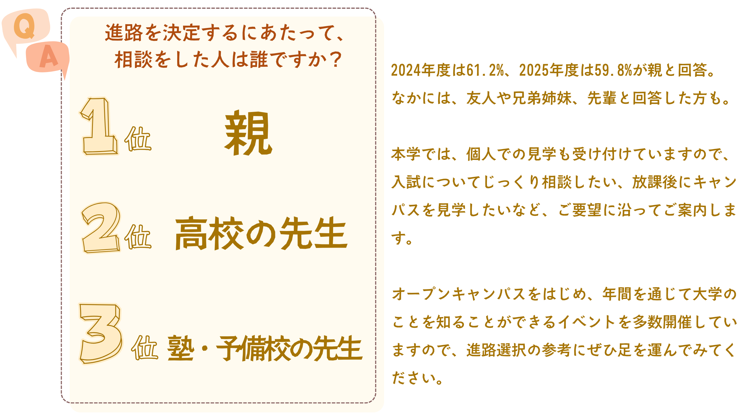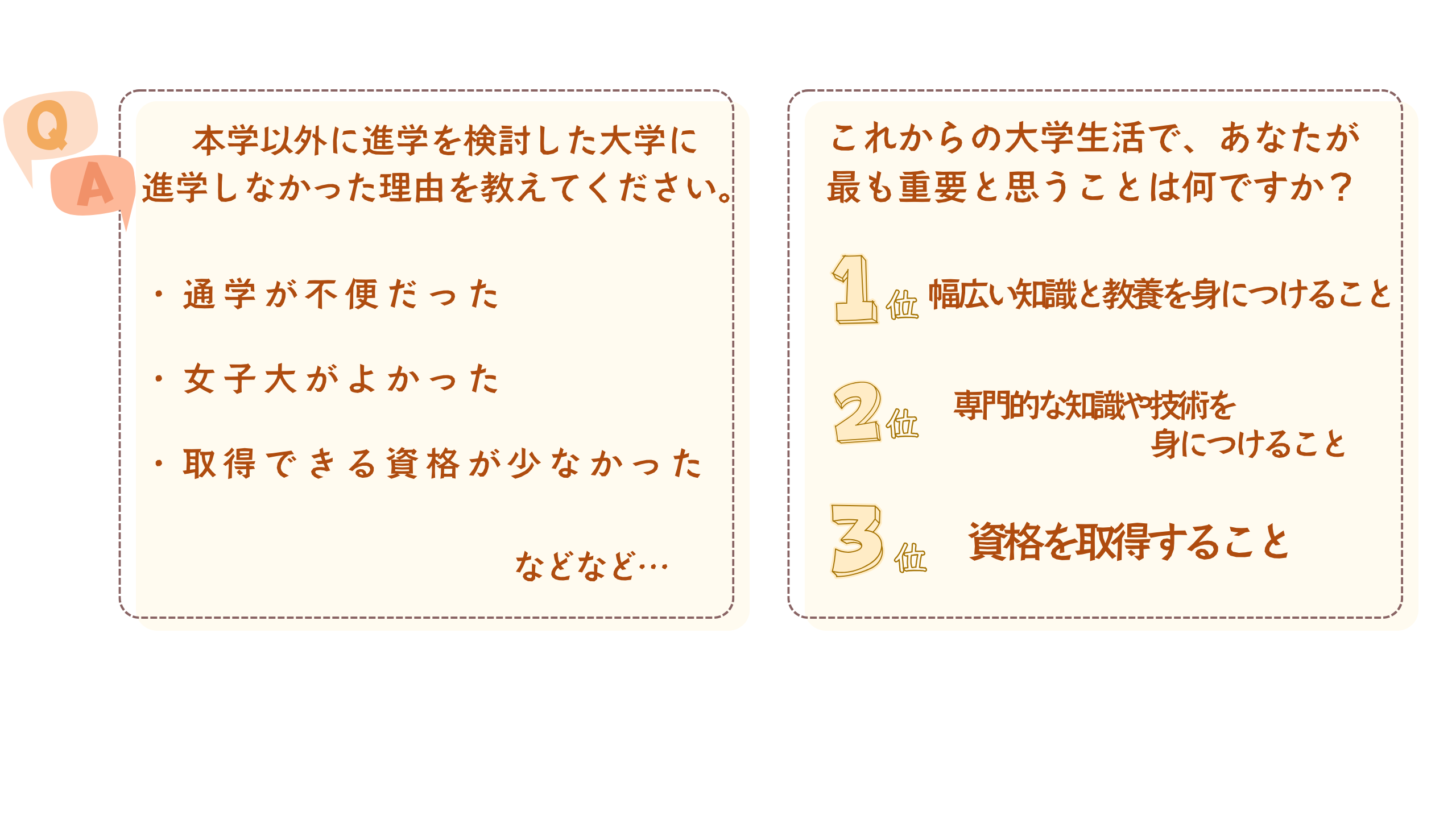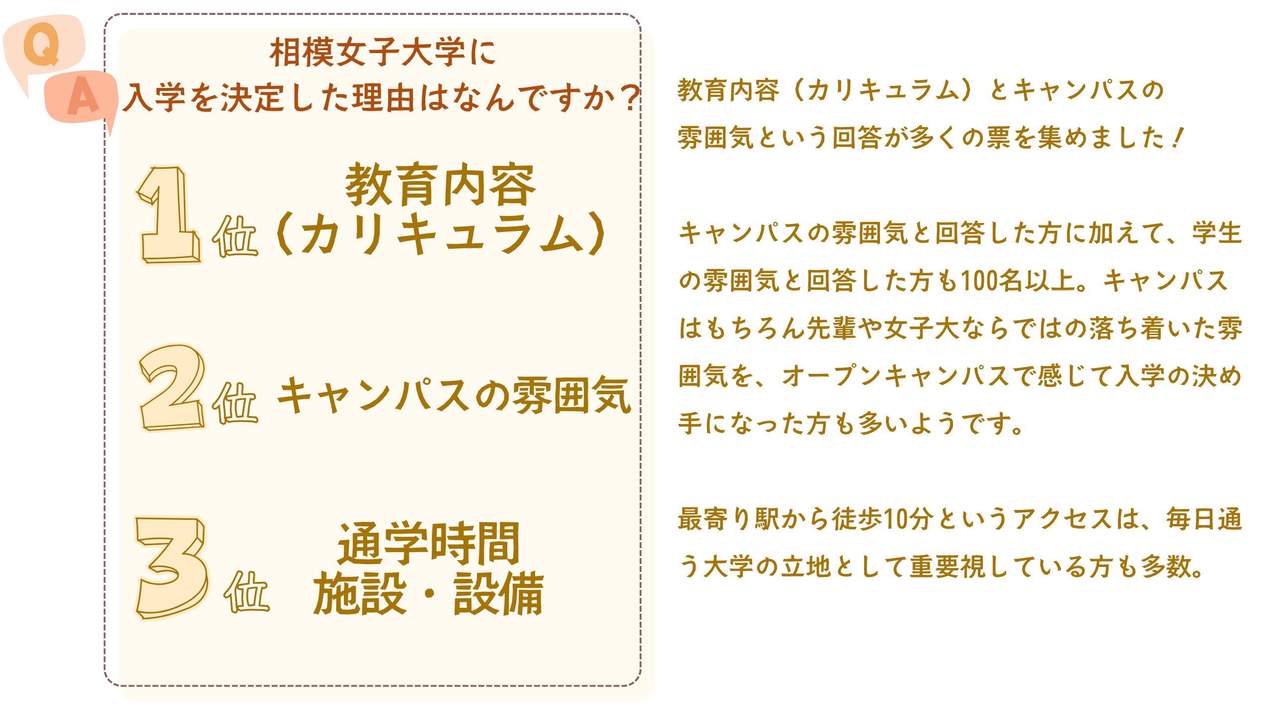 「テレメール全国一斉進学調査」は 進路選びのための活動や、 入学先の大学を決めた理由を後輩たちに伝えるために、毎年、全国で一斉に実施されるアンケートです。これまでの「テレメール全国一斉進学調査」で 先輩たちから寄せられた、相模女子大学に入学を決めた理由を紹介します。
