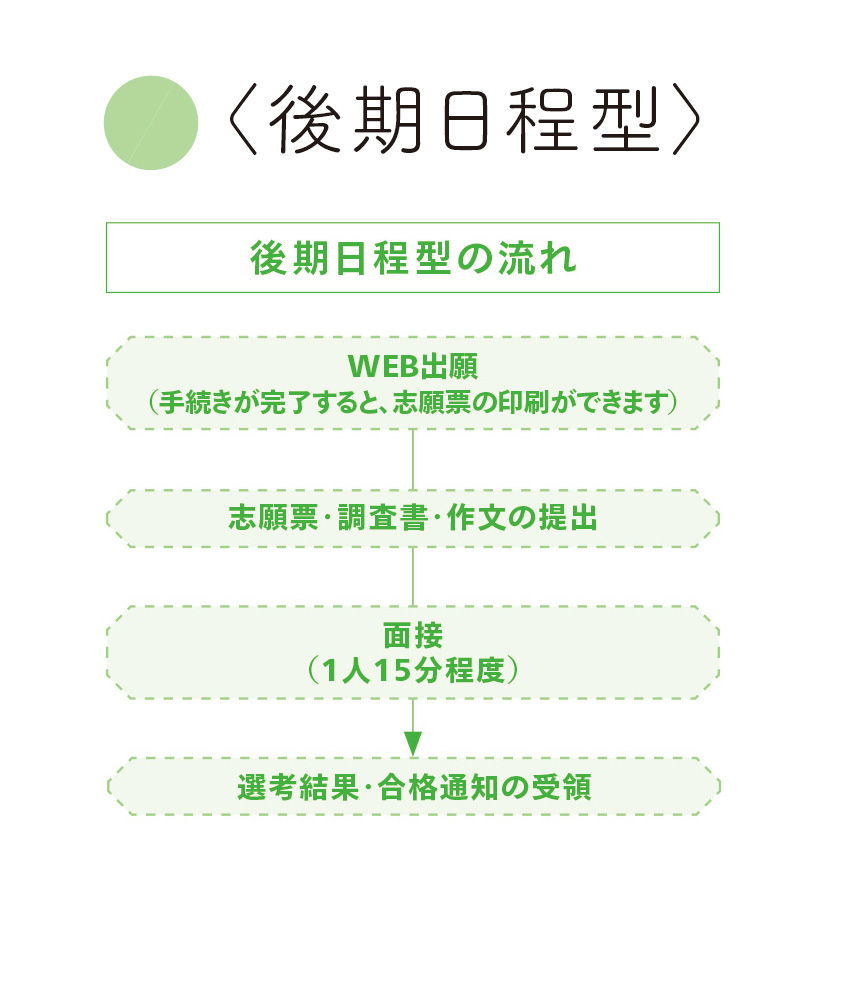 ・後期日程型は12月と3月のみ実施し、調査書、作文、提出物に基づく面接で評価を行います。