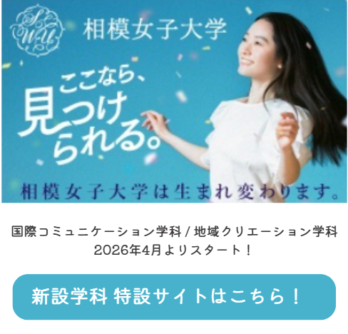 WEBで見る「相模女子大学」はこちら 相模女子大学「Renewal Movie」 「Renewal Book 」上の画像をクリック♪ 「SAGAJO Life」上の画像をクリック♪ ページ内目次 大学イメージ動画 TVCM 相模女子大学のココが好き!RANKING GOOD IDEA STORY 大学イメージ動画 【相模女子大学】大学イメージ動画 相模女子大学・相模女子大学短期大学部 紹介ムービー キャンパスツアー 相生祭へ行こう! ワタシの推し TVCM さがっぱと新学科誕生篇 相模女子大学のココが好き!RANKING 相模女子大学の好きなところ!をランキング形式でご紹介! GOOD IDEA STORY 丸山千枚田魅力発信プロジェクト 各ページへのアクセスは、下のアイコンをクリック! 関連リンク オープンキャンパス 入学・入試案内 資料請求