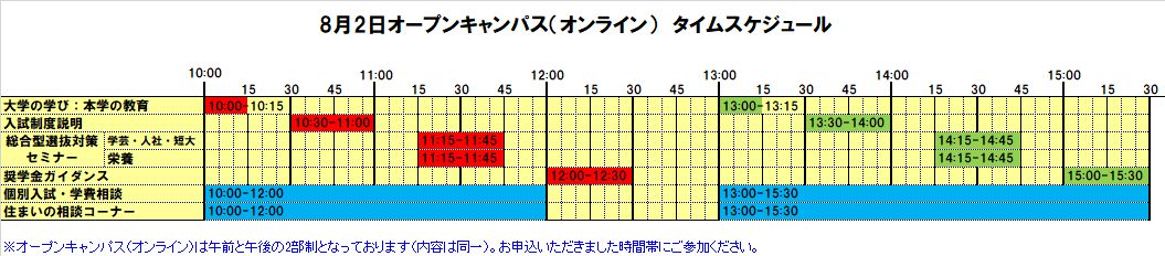 8月2日オープンキャンパス(オンライン)タイムスケジュール