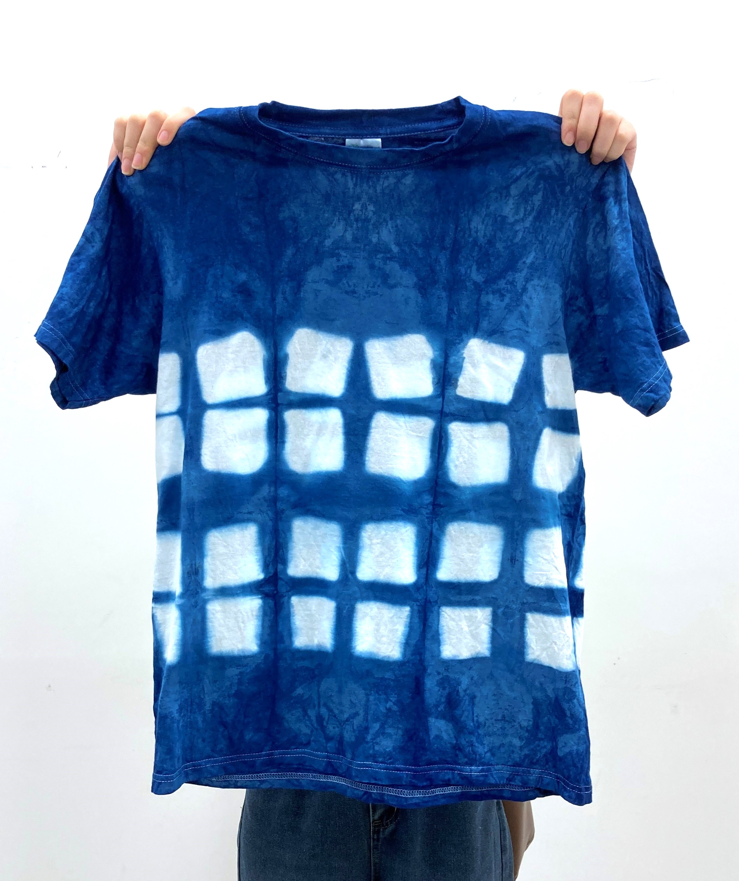 板で挟んで染め模様をつける「板締め」によりTシャツを染めます。板の形によって様々な模様が現れます。