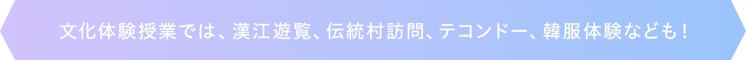 学内の学びだけでなく、単位認定を受けながら韓国のソウル女子大学や、延世大学、高麗大学等で語学研修に参加できる制度を用意。韓国語を学ぶ授業と韓国文化を体験する授業があり、学内外を往復した学びで深めます。