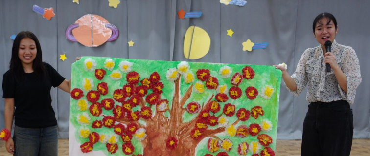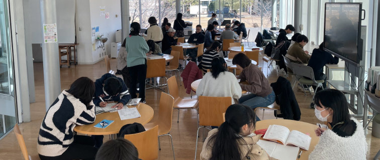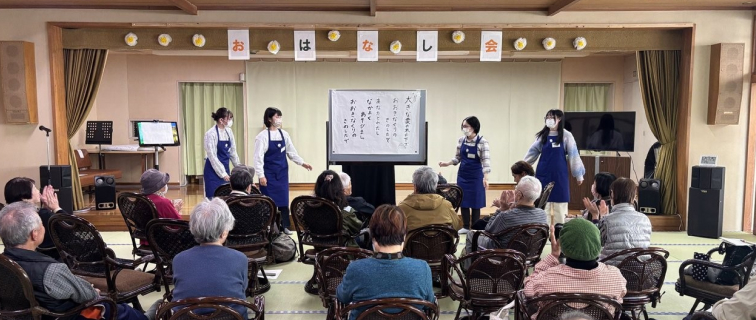「シニアのためのおはなし会」を開催相模原市立図書館との連携活動です。2024年度、図書館司書をめざす学生たちが紙芝居専門家に教わりながらオリジナル紙芝居を作り、高齢者施設でおはなし会を開催。読み聞かせや懐かしい歌を楽しみました。