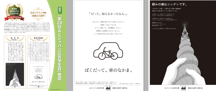 ACジャパン広告学生賞で受賞第20回を迎えたACジャパン広告学生賞において、新聞広告部門で生活デザイン学科の学生2名が制作した公共広告が審査員特別賞と優秀賞を受賞しました。