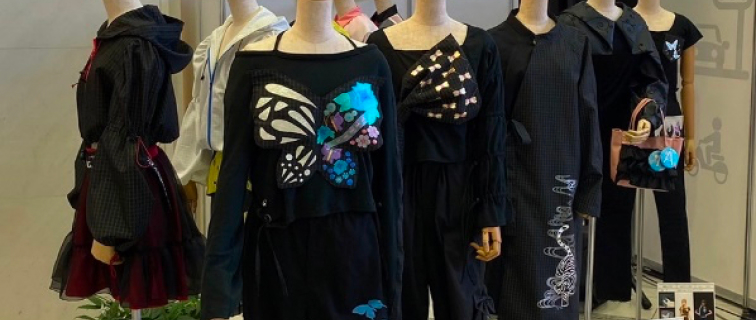 反射材を使ったファッションショー反射材を使ったファッションを学生がデザイン・製作。伝統工芸の金彩工芸とハイテク素材を使ったブラックコーデは、夜間でも歩行者を守ってくれます。学生たちはダンスを披露し反射材の効果をアピールしました。