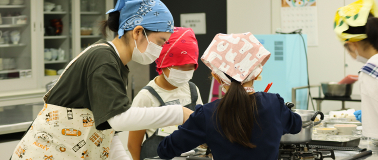 キッズクッキング大学生が「先生」となり、小学生と一緒に「食」を学ぶ講座です。2024年度はさがまちコンソーシアムの学生講師として学生が企画からイベント運営まで担当し、参加児童にテーマについて説明し、一緒に調理をするイベントです。