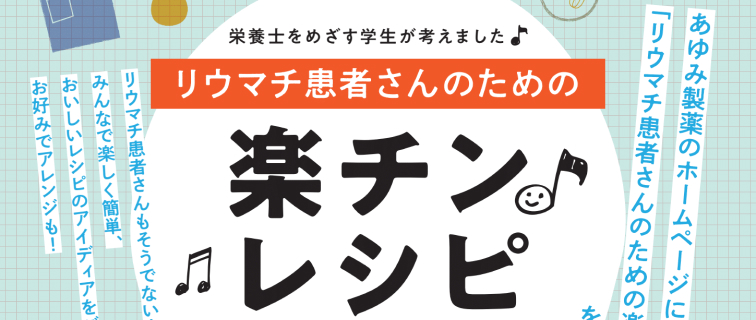 リウマチ患者さんのための楽チン♪レシピだるさや関節の腫れなどで調理に困ることがあるリウマチ患者さんのため、本学学生がレシピを考案。あゆみ製薬のホームページに掲載されました。電子レンジを使って簡単に作れるように工夫されています。