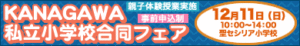 | 【外部フェア】 KANAGAWA 私立小学校合同フェア ![]() | 12月7日 複数の神奈川県の私立小学校の相談ブースや、複数の授業を体験できます。 本校も出展いたしますので是非足をお運びください。 【会場】聖セシリア小学校 |