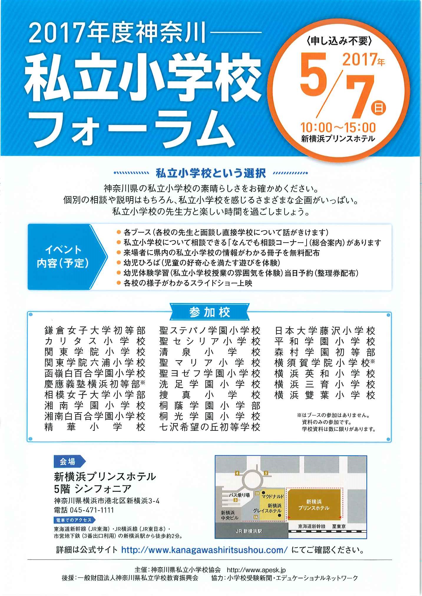 2017年度神奈川私立小学校フォーラムが5月7日(10:00~15:00)に新横浜プリンスホテルで行われます。