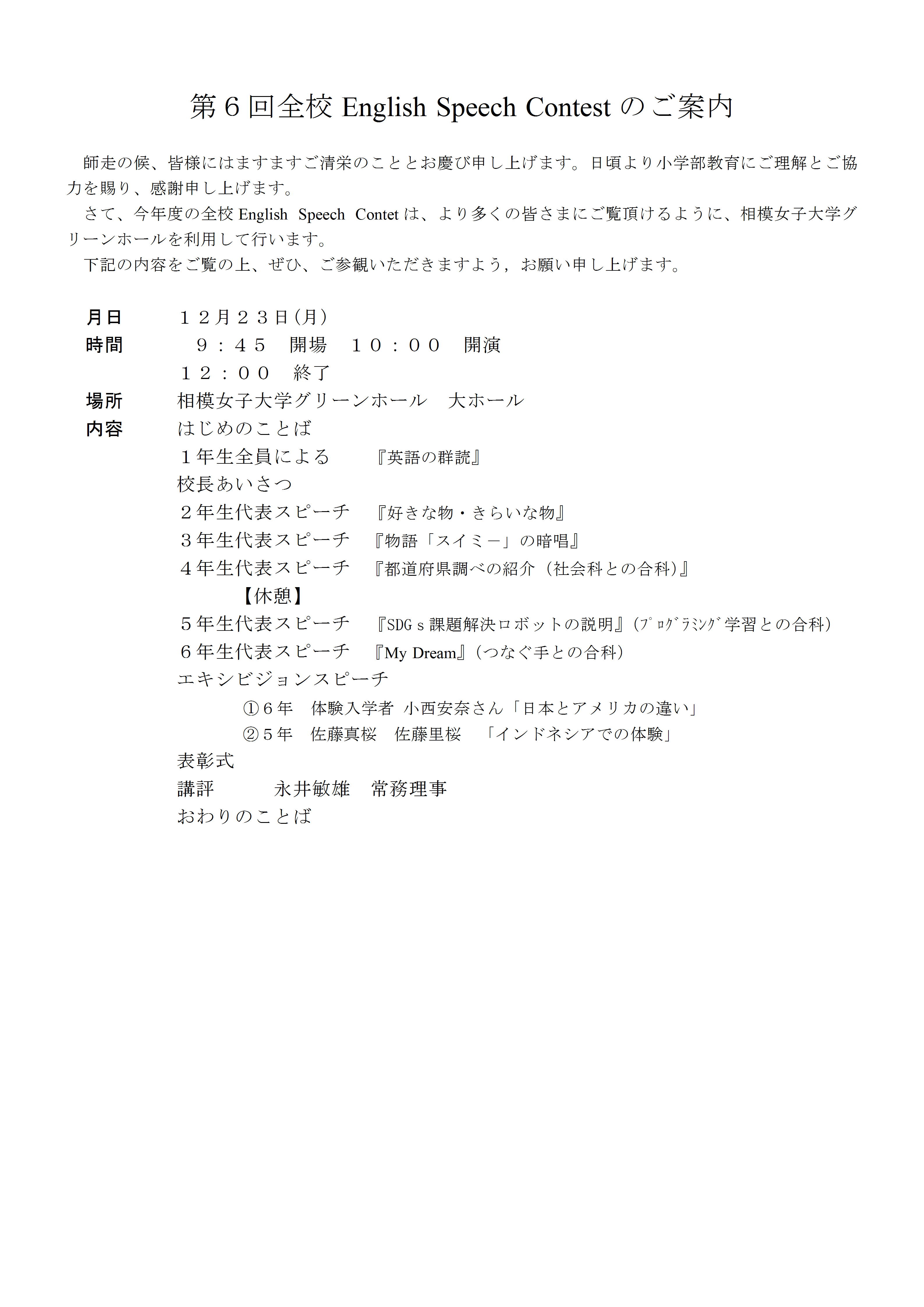 相模女子大学小学部では、日頃の英語教育の成果発表の場の1つとして、English Speech Contestを開催しています。
