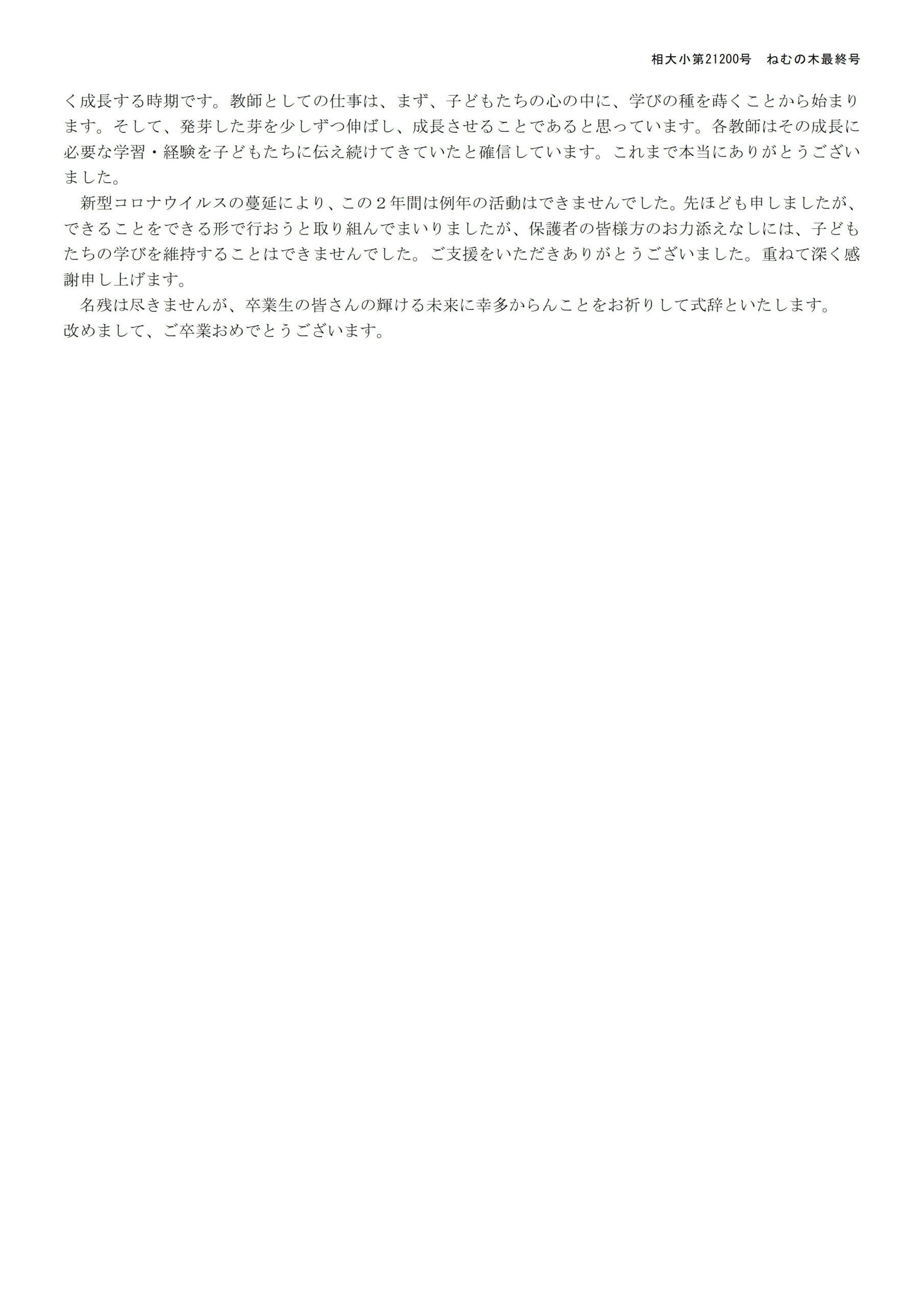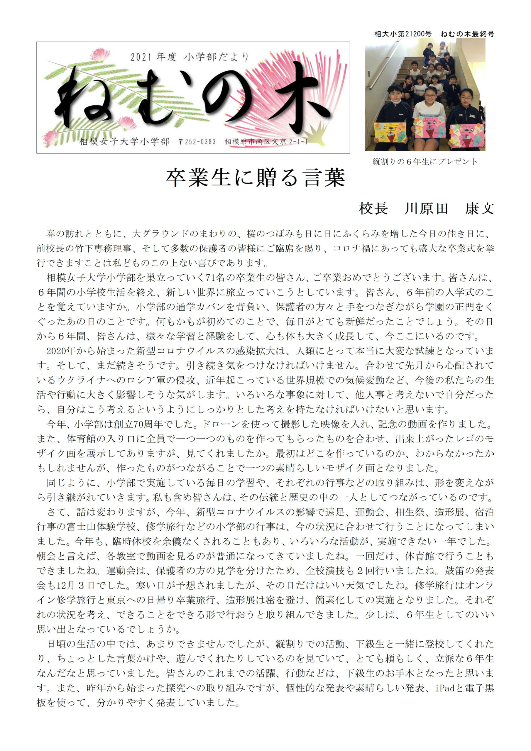 小学部だより「ねむの木」(2021年度 最終号)卒業式祝辞
