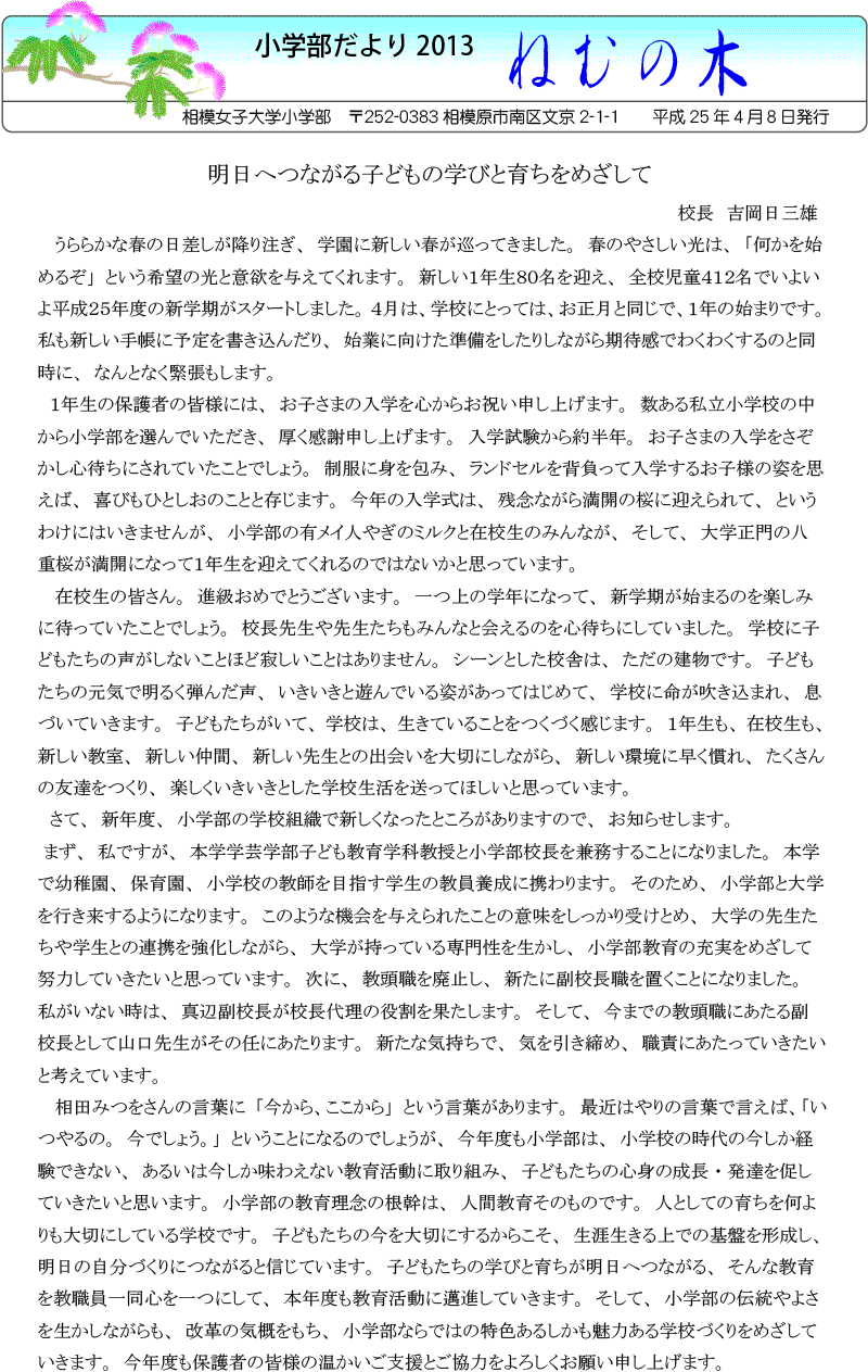 4月号(2013.4.8発行)「明日へつながる子どもの学びと育ちをめざして」