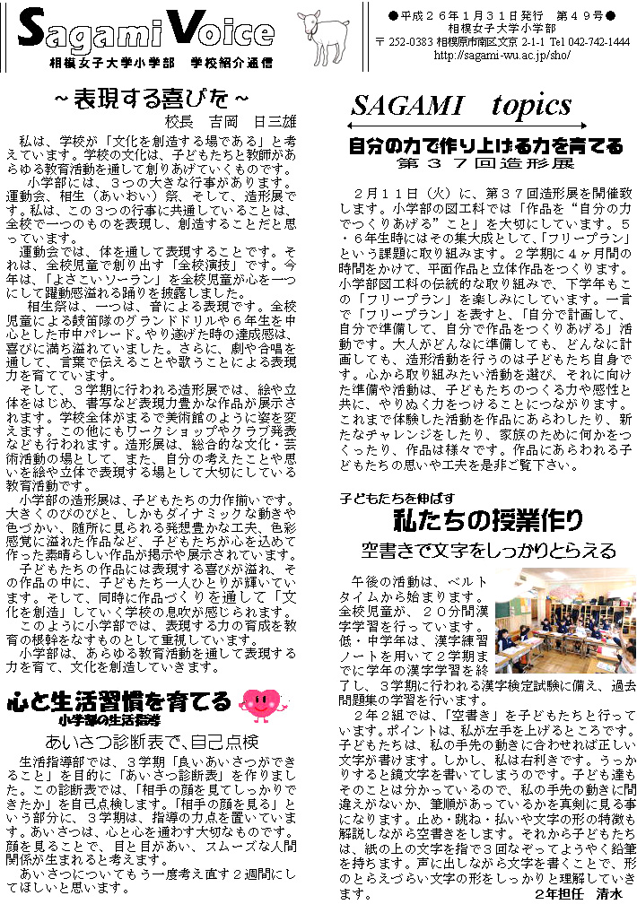 Sagami Voice 49号「表現する喜びを」「小学部の生活指導」「自分の力で作り上げる力を育てる」「空書きで文字をしっかりとらえる」