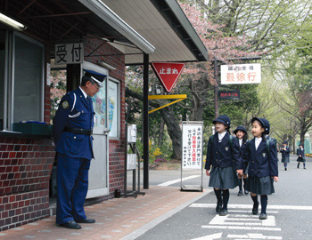 本学園では、安全対策として、学園全ての出入り口に警備員と監視カメラを配置し、来訪者をチェックしています。警備員は、24時間複数体制で常駐し、学園内を定期的に巡回・警備。教員だけでなく、学園全体で子どもの安全を見守る体制をとっています。