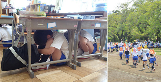 小学部では、子どもたちが災害に巻きこまれたときに、どのように対処するべきかを考えさせるため、防災教育に力を入れています。