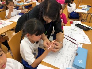 事前にご家庭で使用しているお箸の長さを計って授業に臨んだ1年生。今回の先生は、相模女子大学の栄養教育学研究室のお姉さんたちです。