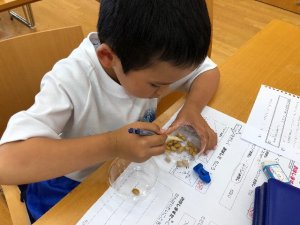 正しい持ち方で、大豆の水煮を移動させるというチャレンジをし、みんなバッチリ出来ました。