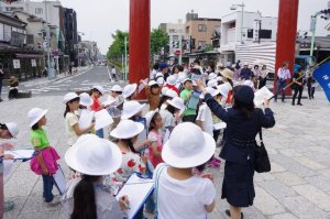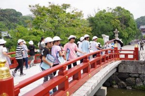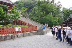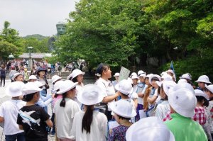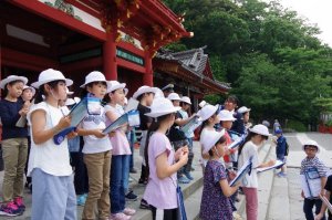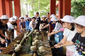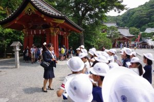 最初の見学地は、鶴岡八幡宮です。神社に入る前の手の洗い方やお参りに仕方を教わって、見学がスタート。