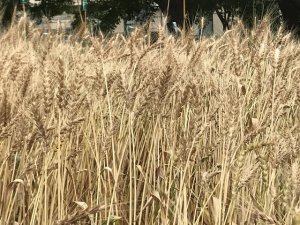 1ヶ月前、観察した時にはまだ、まだ、青々としていた小麦が、ぎっしりとつまった穂をしならせて、金色に輝いていました。