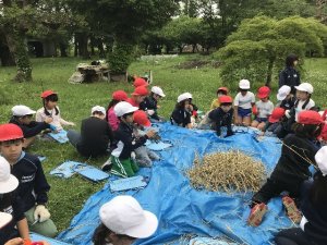 鎌で小麦を刈る人、はさみを使って刈った小麦を穂と茎に分ける人と、分かれて、交代で収穫を行いました。軍手をはめた手で、一握りの茎をつかみ、地面とすれすれのところに、鎌を当てて、慎重に引いて怪我をしないように刈っていきました。次は、刈った穂を乾燥させて、脱穀していきます。