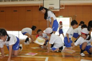 また、体育館では「フルーツアップセット」というゲームをしました。4種類の果物のチームに別れ、制限時間内に、果物が描かれたカードをひっくり返して、自分の果物のカードを多く表に出せたら勝ち、というゲームです。ひっくり返すと、違う果物が出てくることもあるので、バディと一に協力してたくさんひっくり返していました。