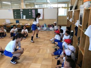 教室では、「ジェスチャー伝言ゲーム」をしました。お題に合わせて、6年生がジェスチャーで伝言していき、最後に1年生が答えます。恥ずかしい気持ちをぐっと抑えて、6年生が1年生にも分かるような身振り手振りを一生懸命考えていました。相手にきちんと伝えようとする、そして相手が意図したことを慮る気持ちを育むゲームです。