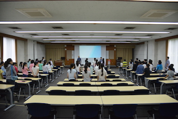 いつもなら、富士カームの大きな庭での朝会になりますが、本日は、大講義室で朝会を行いました。