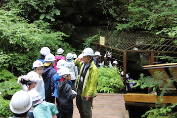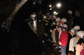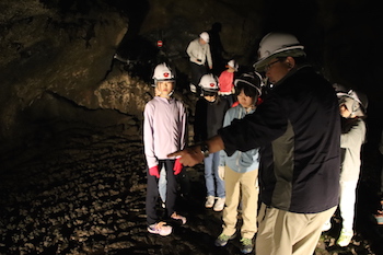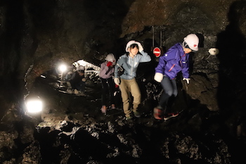 見学の最初に、溶岩トンネルとして有名なコウモリ穴に入りました。中には溶岩が流れ出した縄状溶岩や溶岩ドーム、溶岩棚などの多彩な形状を観察できました。