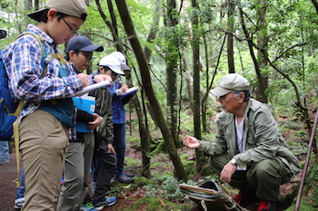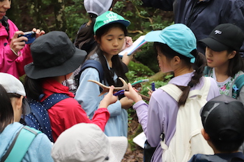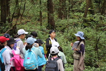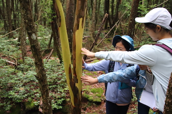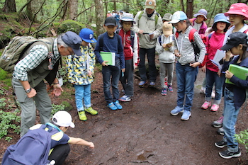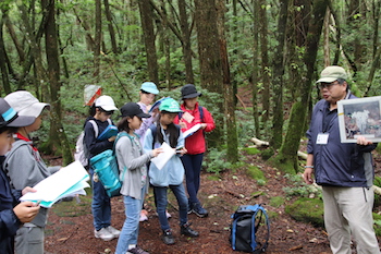 コウモリ穴を見学後、樹海の中を探索です。青木ヶ原溶岩流の上にできた樹海の植生や、そこに生きる動物たちの話をお聞きしながら、2時間ほどかけて野鳥の森公園に到着しました。